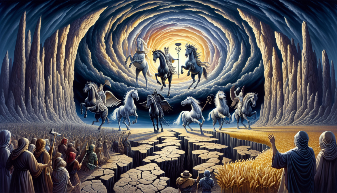 • Third Seal: The black horse rider, holding scales, weighs faith and deeds, revealing a small remnant of true believers.